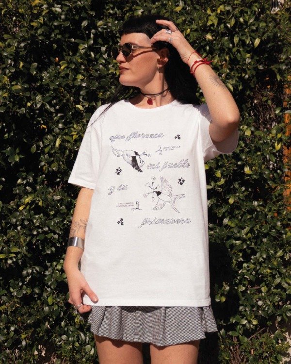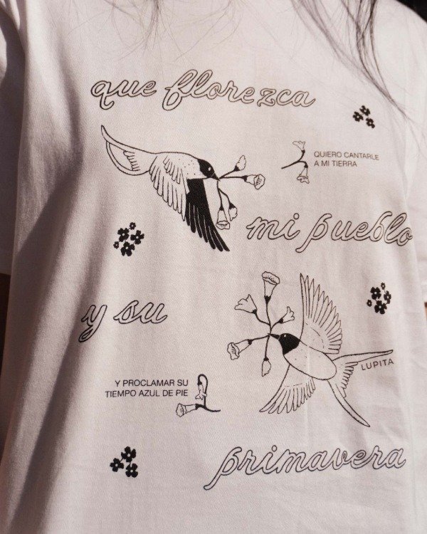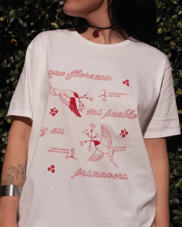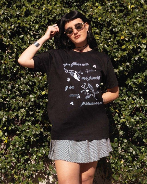 Lleva dos estampas hechas en serigrafía, tanto en el frente así como en el dorso